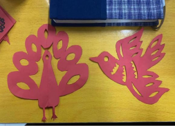 向同学们展示剪纸作品,介绍剪纸技巧、方式、工具