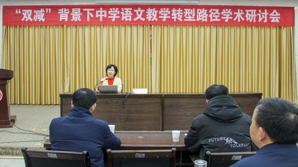 研讨会上,贾玲为本次受聘的行业导师、文传学院汉语言文学专业教师及中学语文卓越师资班的同学做了“育人为本、立足课堂、减负增效”的大会专题报告。贾玲围绕“双减”背景下中学语文教学转型途径,结合生动的语文教学案例,从“用新课程理念建构有效课堂”“树立正确的课堂价值追求”“研究基于课堂标准的教学”等方面进行了分析,讲座既有国家宏观教育政策的解读,也有个人深刻的教学研究、教学体会分享,引发参会师生的共鸣与思考。