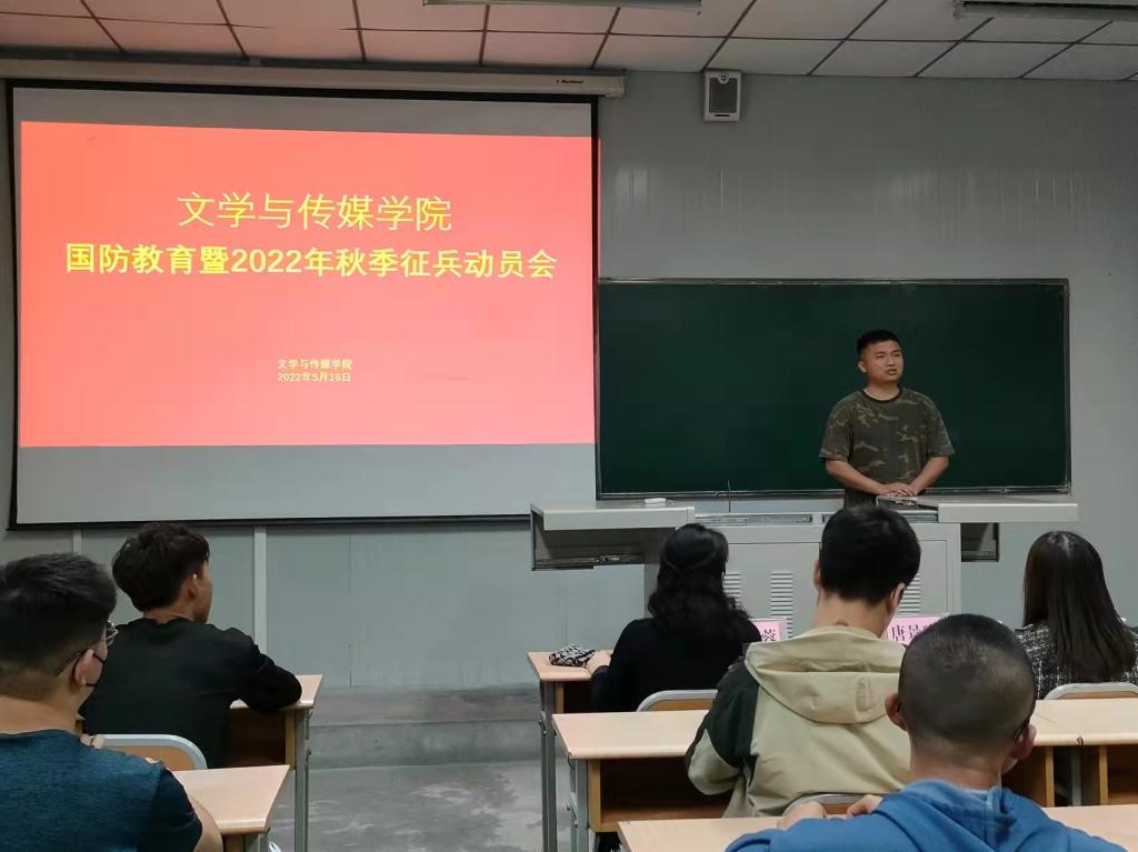 为认真贯彻落实习近平强军思想,进一步加强在校学生国防教育,开拓毕业生就业视野,鼓励适龄青年积极响应国家号召投身军营报效祖国,5月16日下午,文传学院在江南校区1014教室组织召开文传学院国防教育暨2022年秋季征兵动员会。学工部国防教育研究室副主任唐璟瑜,文传学院党总支副书记杨海蓉、院学工办副主任薛涛及60余名大三、大四适龄男生参加了本次动员会。会议由薛涛主持。