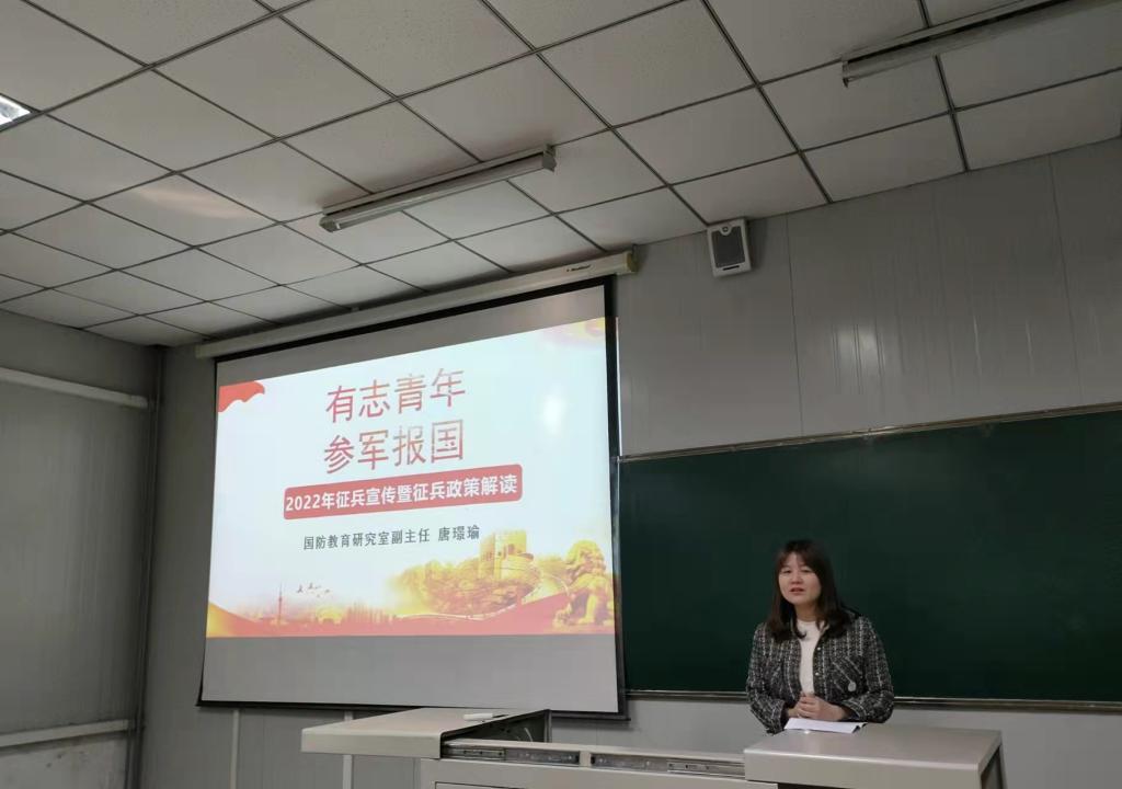 唐璟瑜老师从国家国防教育与青年的使命担当、大学生就业、应征入伍政策解读及体检标准、学籍保留及复学注意事项等四个方面为与会同学作了专题解读。并就报名流程、体检要求等问题为现场同学们答疑解惑。唐老师号召广大适龄青年要以国家需要为己任,积极响应号召,立志到祖国最需要的地方去锻炼,以实际行动投身军营、报效祖国。希望各位毕业生能够利用好新形势下国家的各项优惠政策,积极参军入伍,保家卫国。