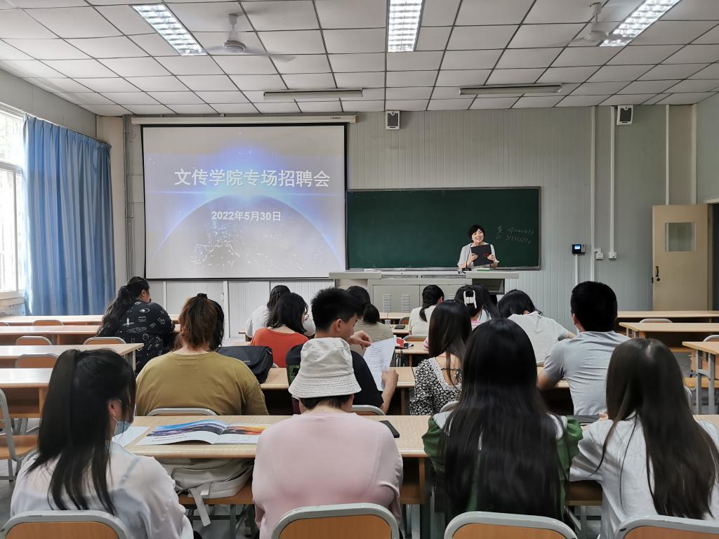 为促进就业工作平稳有序进行,就业帮扶机制发挥实效,2022年5月30日,在1012教室,文传学院2022届毕业生专场招聘会顺利召开。特邀安康墨白文化产业发展有限公司、陕西南枫装饰设计工程有限公司来校做招聘宣讲。文传学院党总支副书记杨海蓉、毕业班辅导员彭潇和今年会官网2022届部分毕业生参会。会议由彭潇主持。