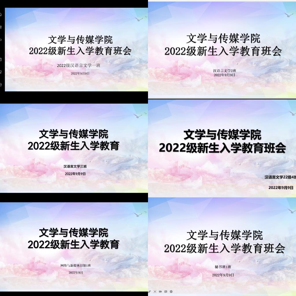 导航痕迹 首页 > 新闻通知 > 学院新闻 > 正文 学院新闻 通知公告 2022级新生入学系列之一:“讲纪律 守规矩”--2022级新生线上班会 发布人: 发布日期:2022年09月13日 阅读次数: 根据学校《窗体顶端 窗体底端 为帮助2022级新生提前适应校园生活、了解学校学生管理相关制度,帮助新生尽快转变角色,开启新征程,根据学校《关于做好2022级新生线上入学教育工作的通知》要求,结合《文传学院新生入学教育安排》,文传学院于9月9日晚通过腾讯会议召开2022级线上新生教育班会。 会上,辅导员李欣逸对新加入文传学院大集体的新生表示热烈欢迎,对学生提出的相关问题进行了解答,并对全体新生提出要求和期望。各班代理班主任围绕《学生手册》相关内容、第二课堂、学校相关政策制度进行详细讲解及答疑。 本次线上班会,缓解了延迟进校新生的焦虑情绪,增强了新生的纪律意识、规矩意识,为迎接即将到来的健康有序大学生活奠定了良好的基础。 撰稿、图片/ 李欣逸 审核/ 杨海蓉 发布/薛涛