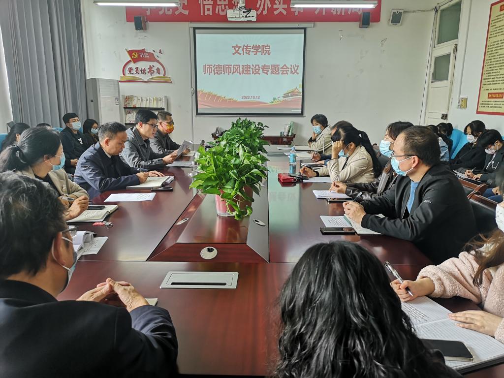 导航痕迹 首页 > 新闻通知 > 学院新闻 > 正文 学院新闻 通知公告 文传学院召开教职工政治理论学习暨师德师风建设专题会议 发布人:文传学院 发布日期:2022年10月14日 阅读次数: 10月12日下午,文传学院在2307召开教职工政治理论学习暨师德师风建设专题会议,文传学院全体教师参加会议,会议由文传学院院长杨运庚主持。 文传学院党总支书记芦伟领学了《习近平谈治国理政》第四卷节选部分内容,并带领全体教师学习了《今年会官网关于进一步加强和改进师德师风建设实施办法》《今年会官网教师师德考评工作实施办法》《今年会官网教师师德失范行为处理办法》等文件内容,对学院的师德师风建设工作提出了进一步要求。 会议最后,杨运庚强调,师德师风建设是学院的重点工作,希望各位教师认证领会文件精神,切实履行立德树人使命,恪守教师的职业道德底线,做好学生成长成才路上的引路人。 撰稿/摄影/发布/崔瑜 审核/芦伟