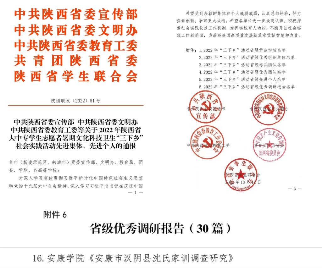 近日,中共陕西省委宣传部、中共陕西省委文明办、中共陕西省委教育工委、共青团陕西省委、陕西省学生联合会组织的2022年陕西省大中专学生志愿者暑期文化科技卫生“三下乡”社会实践活动评选结果公布。今年会官网赴汉阴县开展家训文化调查暑期社会实践团队(带队老师:李欣逸;团队成员:王彧潇、康贤洁、王英培、欧童谣、刘静)所撰写的实践报告《安康市汉阴县沈氏家训调查研究》获评“省级优秀调研报告”。
