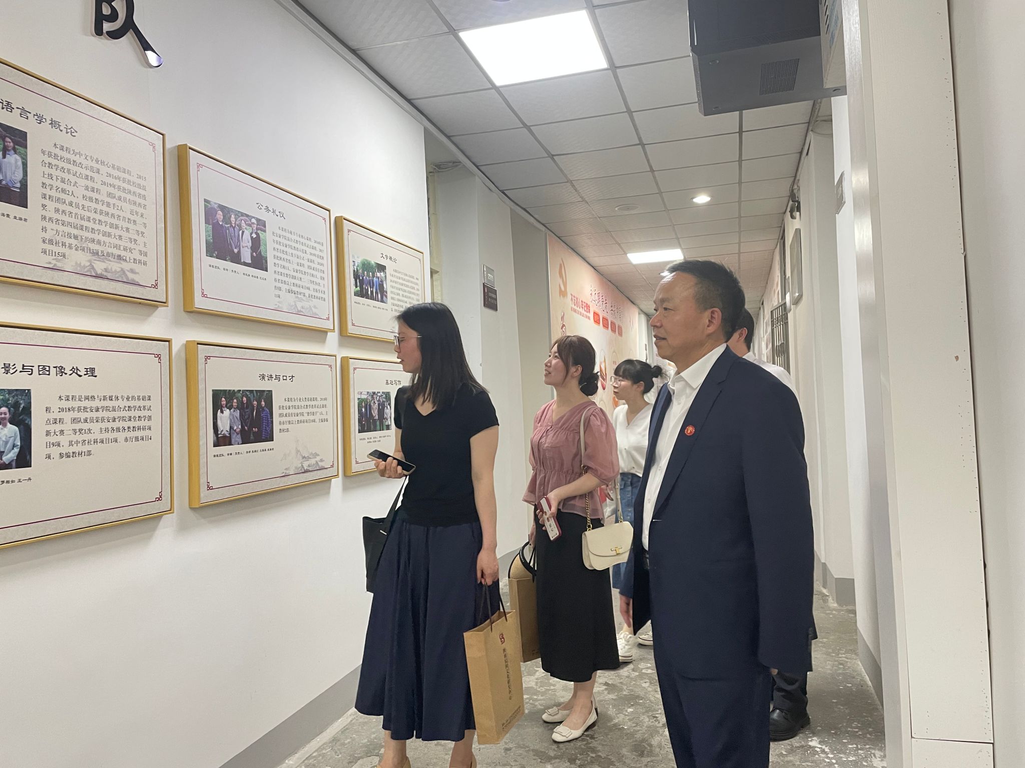 座谈会后,校友们相约漫步在文传学院走廊里,观看了文化墙;走过当年上课的教室,重温自己的大学时光;驻足在一张张毕业照前,寻找当年青春的笑靥;与偶遇的恩师追忆教诲,合影留念保留下珍贵的记忆。校友们感叹母校的变化,并诚挚祝福母校越来越好!