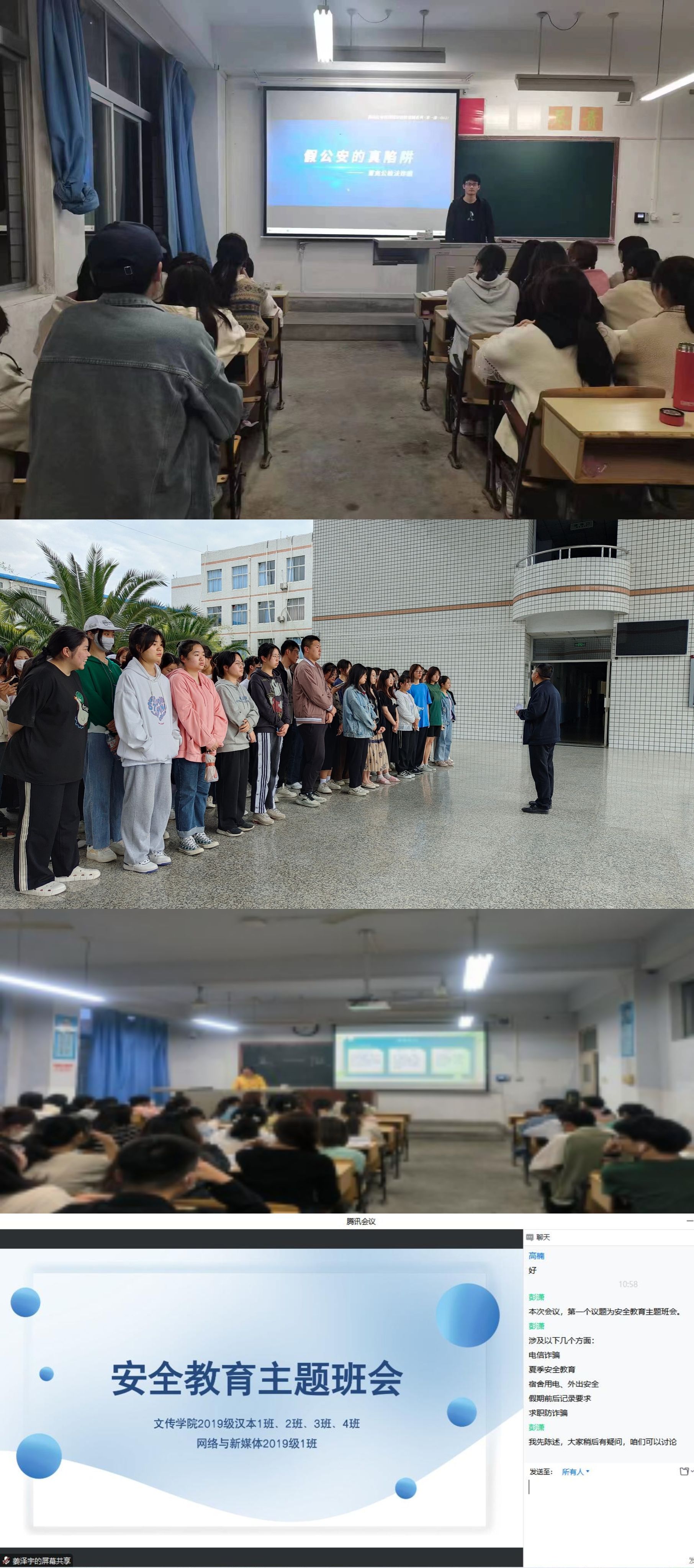 导航痕迹 首页 > 新闻通知 > 学院新闻 > 正文 学院新闻 通知公告 今年会jinnianhuicom召开安全教育主题班会 发布人: 发布日期:2023年04月28日 阅读次数: 为落实学校稳定安全工作会议精神,筑牢校园安全防线,保障学生的人身财产安全,2023年4月27日~28日期间,今年会jinnianhuicom组织全体学生召开了安全教育主题班会,强调了“五一”长假期间应注意的安全事项和每日报备制度;要求外出学生注意交通安全,不要去危险的地方游玩;叮嘱学生要注意饮食卫生,出门戴好口罩,确保卫生健康;重申学校规章制度,要求学生注意宿舍用电安全,不得使用违规电器;针对近期电信诈骗典型案例进行讲解,帮助学生提高防范意识,谨防各种诈骗,确保财产安全。 通过假前安全教育主题班会,进一步提升了今年会官网学子的安全防范意识、强化了学生们服务社会锤炼自身的思维广度,为促进学生积极向上、健康成长奠定了基础。 (撰稿/邹棠华 审核/杨海蓉 发布/彭潇)