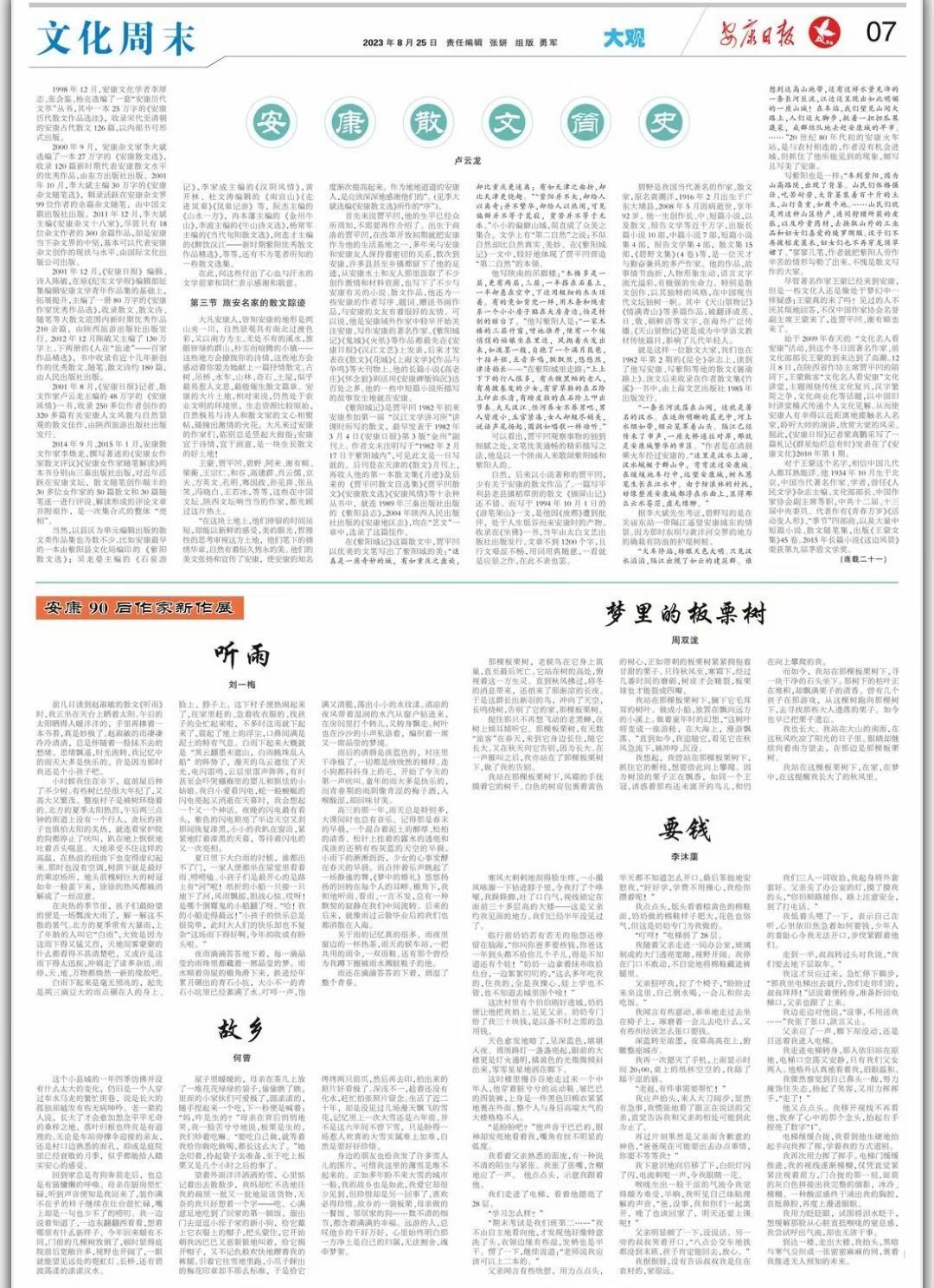 导航痕迹 首页 > 新闻通知 > 学院新闻 > 正文 学院新闻 通知公告 心怀文学梦,执笔写风华 发布人:文传学院 发布日期:2023年09月01日 阅读次数: 2023年8月25日,文传学院四位学子的文学作品在《安康日报》刊登,作者及作品为周双泷《梦里的板栗树》、刘一梅《听雨》、李沐蕖《要钱》、何曾《故乡》。 为培养“能说、会写、善教”实践能力突出的专业人才,文传学院持续提高学生的学科素养能力,突出汉语言文学专业的特色与优势,注重对学生写作能力的濡染熏陶。文学创作社以提高文学素养,促进写作能力为目标,定期举办各种文学竞赛活动。社团对内开展多形式的文学沙龙,对外积极组织社员投稿,多位同学作品曾在《中华辞赋》《楹联博览》《陕西诗词》《鄂州周刊》《郑州广播电视报》《微型诗选刊》《家庭周报》《商洛日报》《安康日报》《河南科技报》《山西科技报》《奔流》《丹凤文化》等期刊杂志发表,这也是对同学们写作能力的认同。在学院的支持和同学们笔耕不辍的努力下,文学社成员收获良多。文传学院坚持守正创新,师生共同努力创作大量优秀文学作品。教师们以丰富的专业知识、深厚的教育情怀和极强的实践能力提供了良好的学习氛围,培养学生理论与实践同步提升。 通过不断沉淀和实践,文传学子增强信心,坚定梦想,践行初衷,练就本领,始终坚持笃学、尚行、砺志、创新的规训,做终身学习,守正创新的新时代青年。 安康日报电子版链接:http://sjk.akxw.cn/epaper/read.do?m=i&iid=2473&eid=17816&idate=1_2023-08-25 撰稿/何曾 审校/杨海蓉 发布/崔瑜