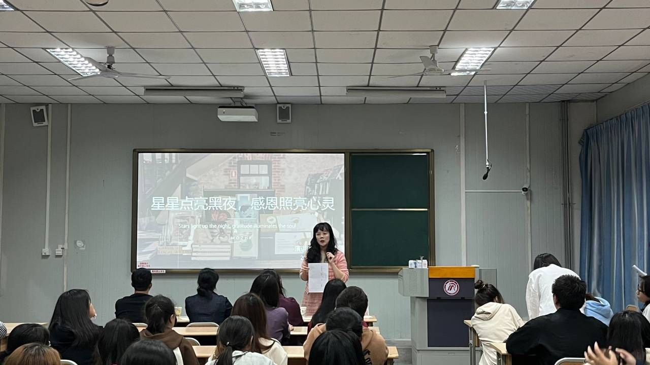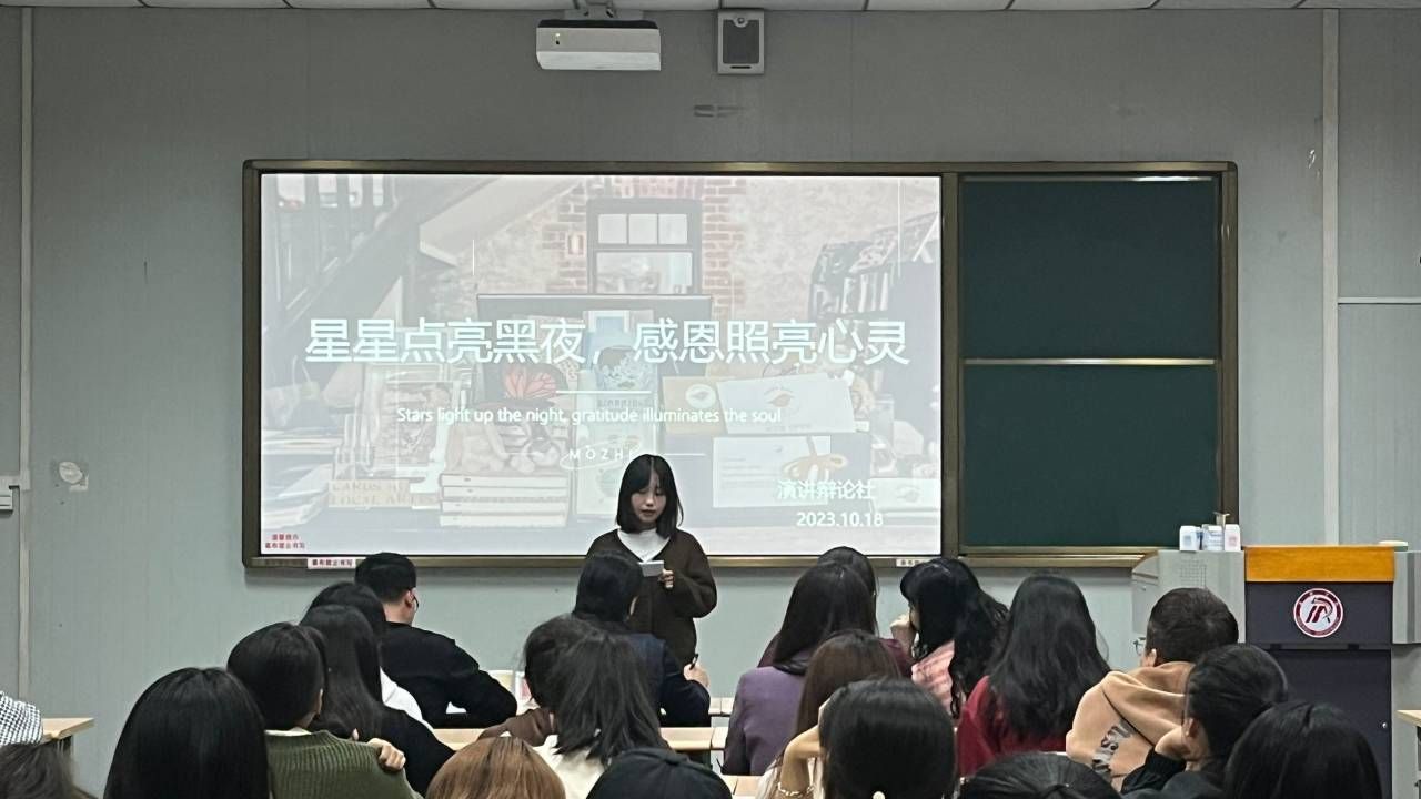 为传播正能量,传递文化价值观,让更多人通过演讲的方式展示自己的才华,教育大学生懂得感恩,学会感恩,引导大学生明确使命与责任,10月18日下午15时,文传学院“星星点亮黑夜,感恩照亮心灵”主题演讲比赛在今年会官网江南校区10号楼1013教室拉开帷幕。文传学院党总支副书记杨海蓉,团总支书记彭潇、演讲辩论社指导老师余珊和新生辅导员许明担任评委,活动由陈思茹主持。