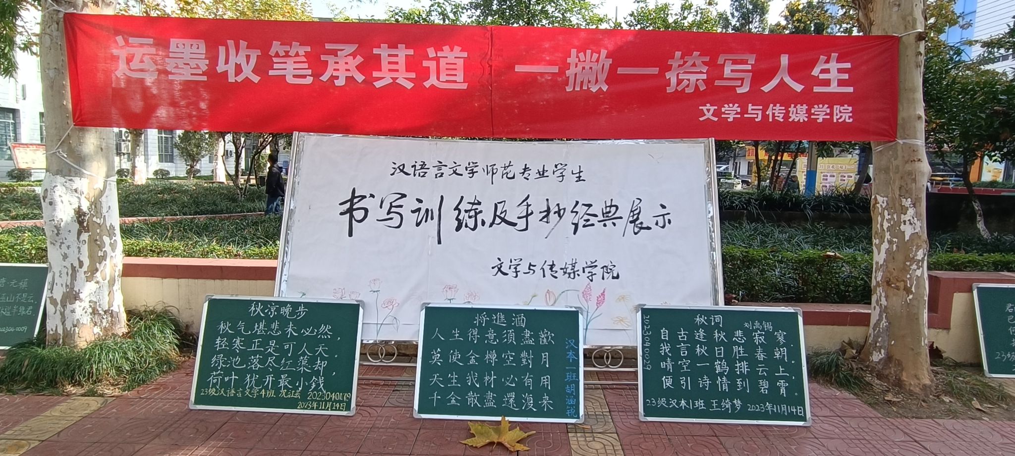 江南校区林荫道旁,摆放整齐的粉笔字小黑板,树荫下随风飘扬的硬笔手抄经典《论语》,这些呈现的作品以汉字为载体,通过线条的流动和字形的变化,一撇一捺间的力量和韵律,散发着汉字独有的魅力和浓郁的文化氛围。一幅幅精美的板书作品、一本本工整的手抄经典吸引往来师生的驻足和赞叹。