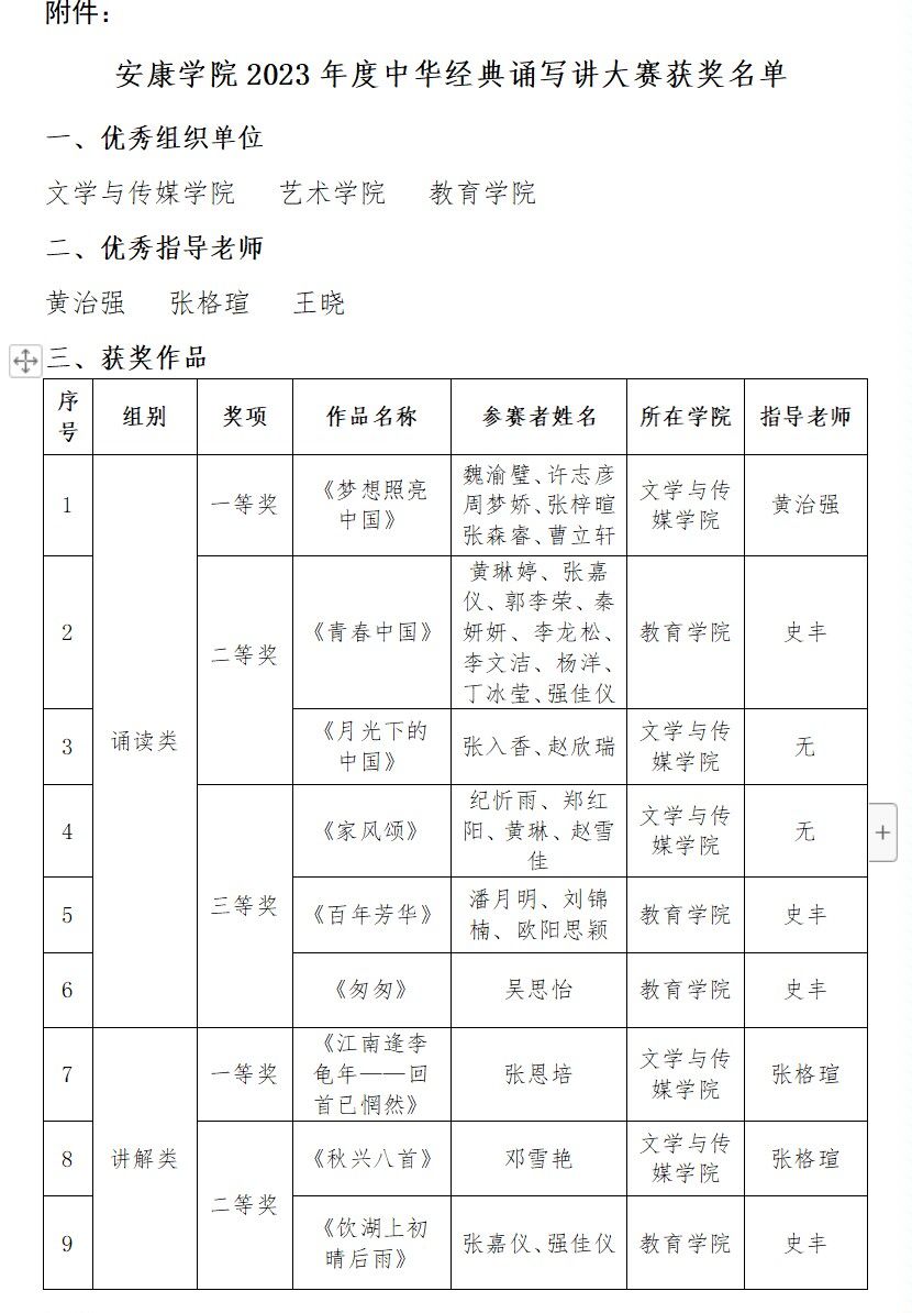 今年会jinnianhuicom在2023年度中华经典诵写讲大赛中成绩突出,荣获诵读类一二三等奖各一项;讲解类一二等奖各一项,三等奖三项;书写类一等奖一项,三等奖两项。黄治强、张格瑄荣获优秀指导老师荣誉。文传学院被评为优秀组织单位。在此向获奖师生予以祝贺!