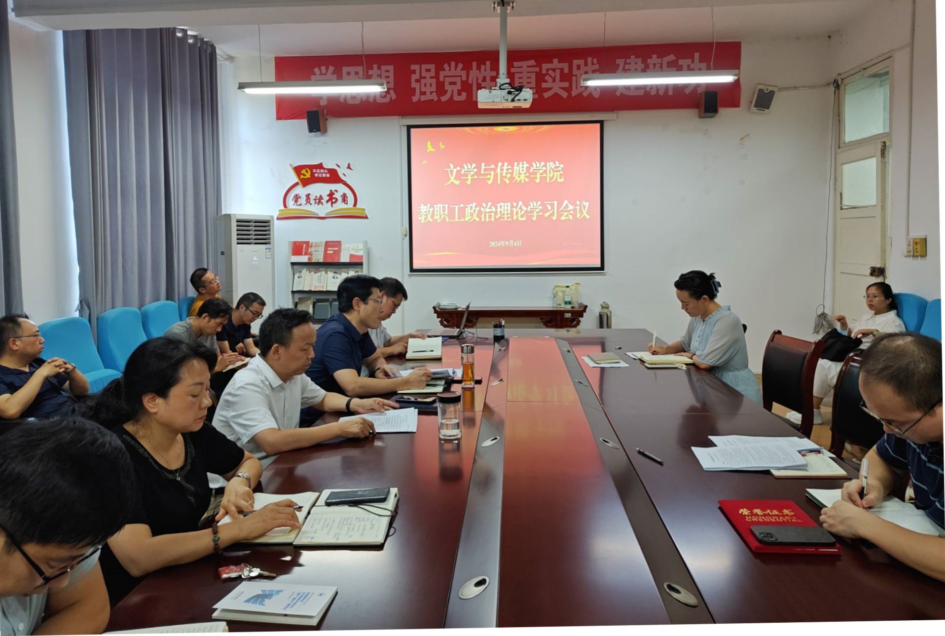 会议最后,文传学院党总支书记芦伟组织全体教职工政治理论学习,深入解读了《中共中央关于进一步全面深化改革推进中国式现代化的决定》和《中共中央国务院关于弘扬教育家精神加强新时代高素质专业化教师队伍建设的意见》精神,要求全体教师要心怀“国之大者”,以党的二十届三中全会精神为导向,不断提升自身学科能力、学科素养、师德师风素养和教书育人能力,自觉践行教育家精神,争做“四有好老师”,当好“四个引路人”,努力做精于“传道授业解惑”的“经师”和“人师”的统一者,成为学生为学、为事、为人的“大先生”。