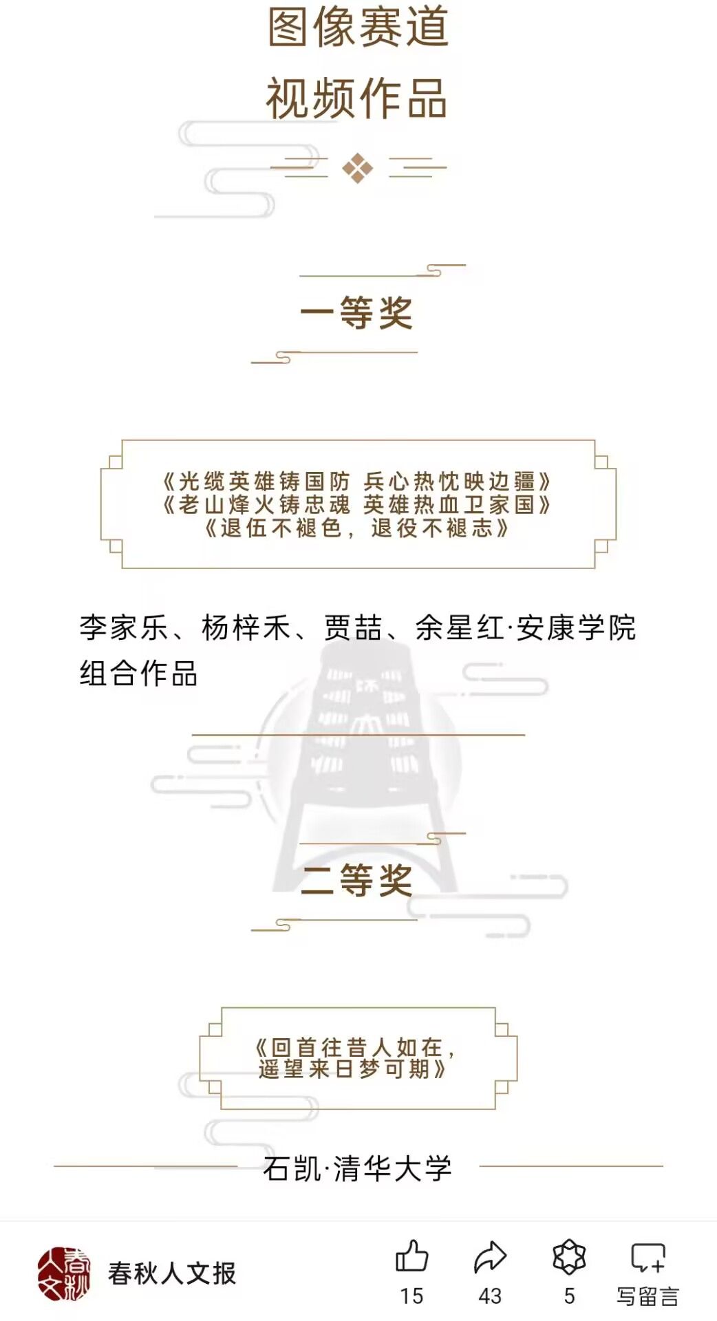 据悉,本次比赛以“家国拾念”为主题,由北京师范大学春秋人文报主办,北京师范大学历史影像研究中心、西安交通大学《大学》杂志社等诸多高校组织和团队合办,得到全国高校有志于家史搜集、记录、研究的同学广泛参与。