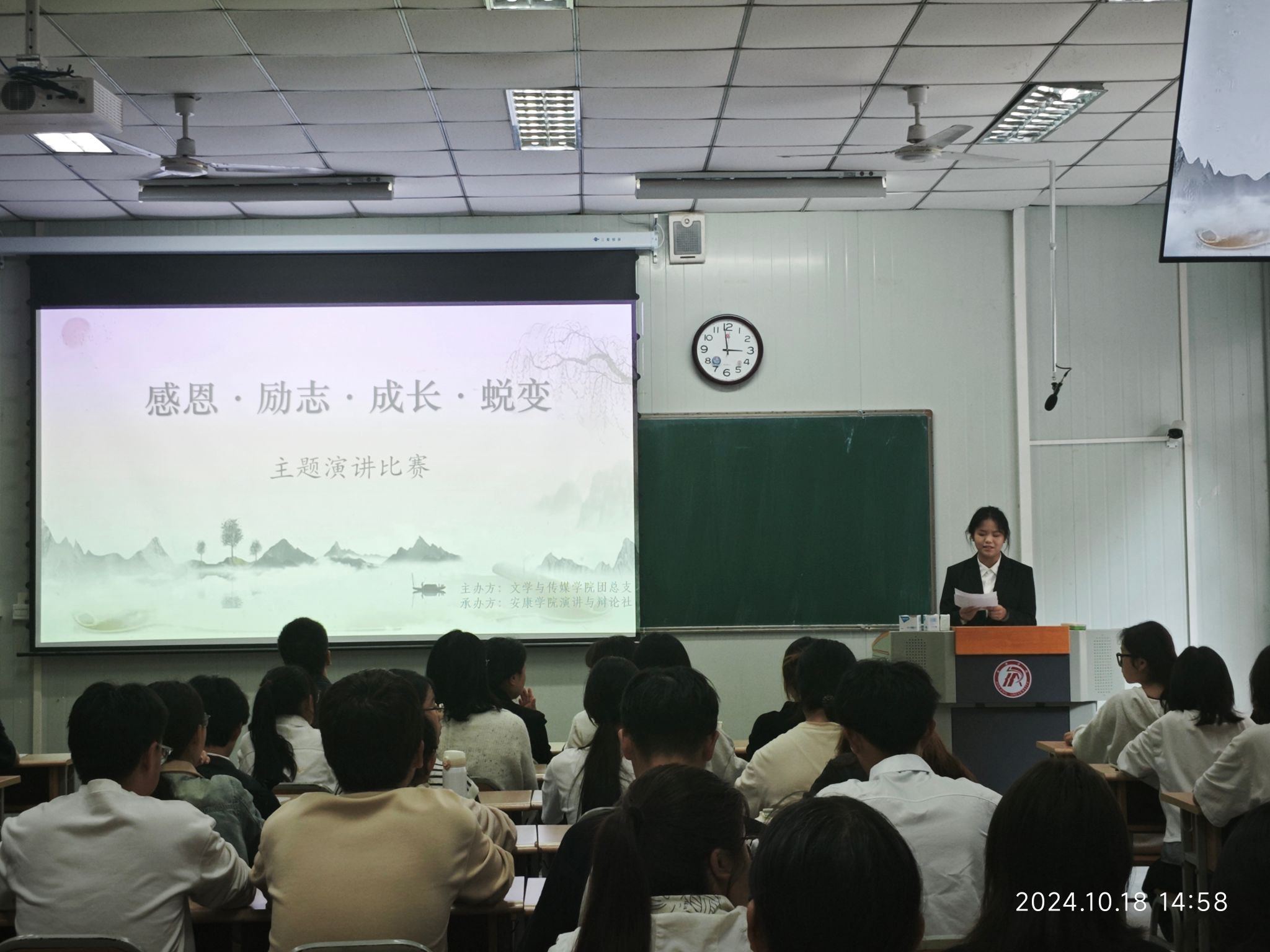 为了充分展示我校大学生的文明素养,引导大学生体悟感恩,培育感恩情怀,做有责任担当的新时代青年,10月18日下午15时,演讲辩论社在江南校区10号楼1017教室举行“感恩·励志·成长·蜕变”主题演讲比赛。文传学院党总支副书记杨海蓉、播音主持社指导老师黄治强、演讲辩论社指导老师余珊担任评委。演讲辩论社王淼同学主持比赛。
