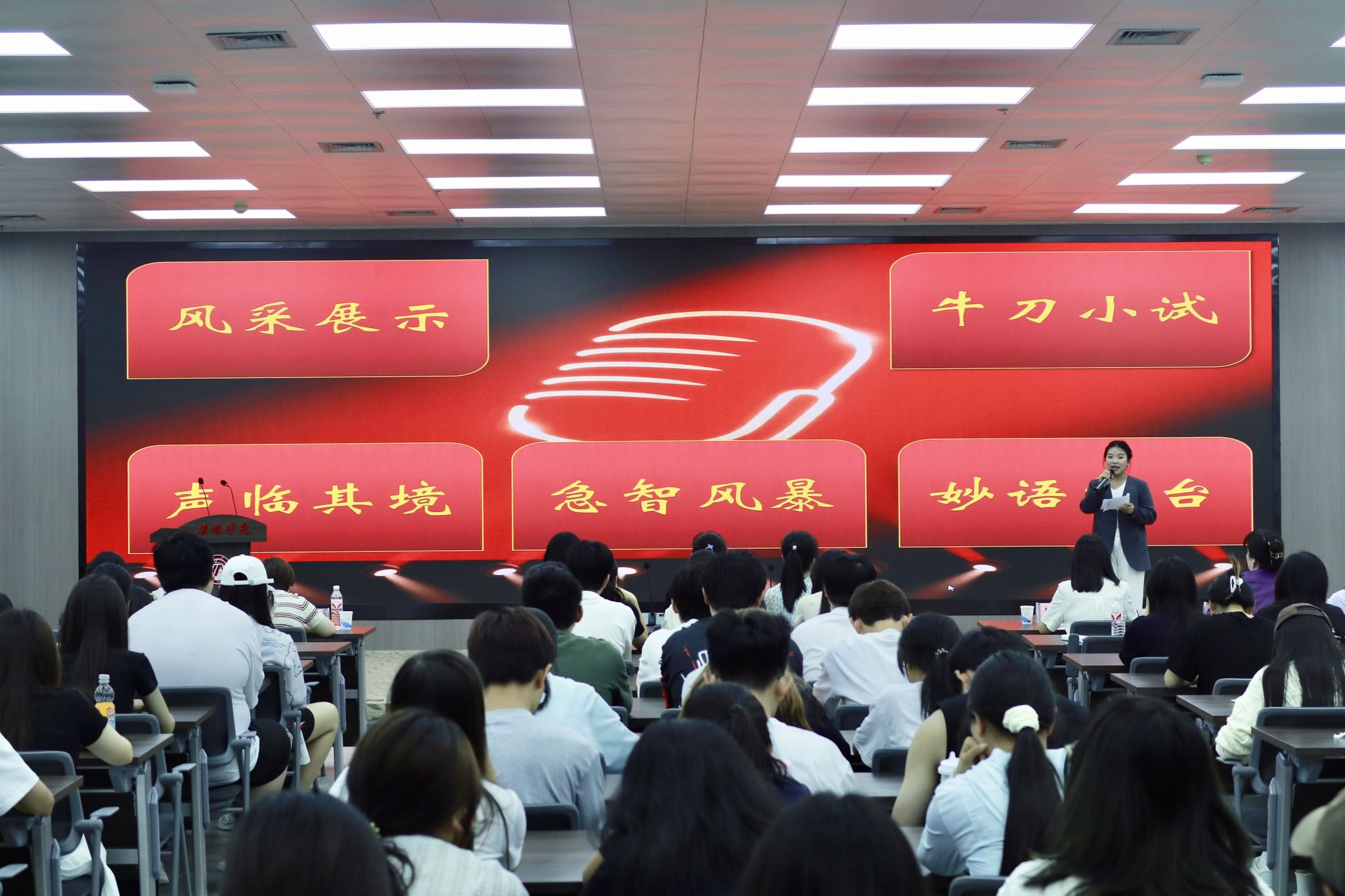 本次大赛共有来自经管学院、农生学院等7个学院的25位选手参加,经过初赛的严格选拔,最终12位选手进入决赛。决赛共设置了五大环节全面考察选手综合素养,包括展现个性魅力的“风采展示”、彰显主持创意的“牛刀小试”、考验临场功底的“声临其境”抽题展示、检验急智反应的“急智风暴”无稿主持,以及聚焦专业思辨的“妙语擂台”评委问答。选手们在各环节中轮番亮出“十八般武艺”,表现出扎实的语言功底与舞台掌控力。