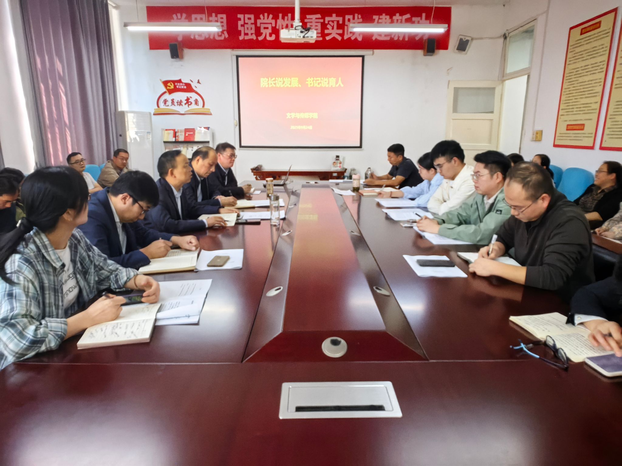 任森龙书记重点介绍了学院党建与育人深度融合的实践路径和成效。学院党总支以“五育传家”党建工作体系为引领,推动党建与业务同频共振,2022年获批“全省党建工作标杆院系”培育创建单位。通过家风家训育人、红色文化教育、课程思政建设等特色活动,学院构建了“凡入文传,必学家风”的思政教育机制。学生先后在经典诵读、网络文化节、创新创业竞赛中荣获省级以上奖项多项,教工党员获省级教学竞赛、思政标兵等荣誉多项,形成了党建带团建、党风促学风的良好育人生态。