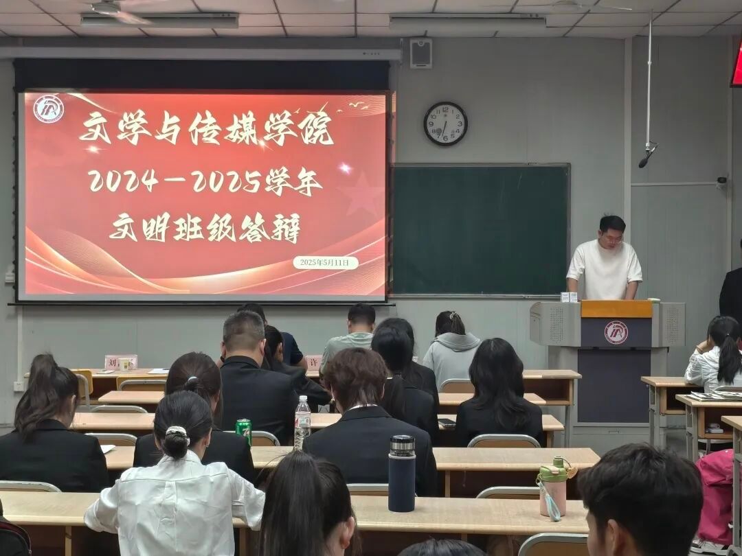 为推进班风建设,规范班级管理,增强班级凝聚力,营造良好的校园文化和学习氛围,5月11日下午,文传学院于1017教室开展2024—2025学年文明班级答辩活动。活动特邀院学工办主任薛涛、辅导员许明、刘言军和喻言担任评委,2022—2024级各班学生代表参加,活动由汉语言文学2024级1班李炫烨主持。