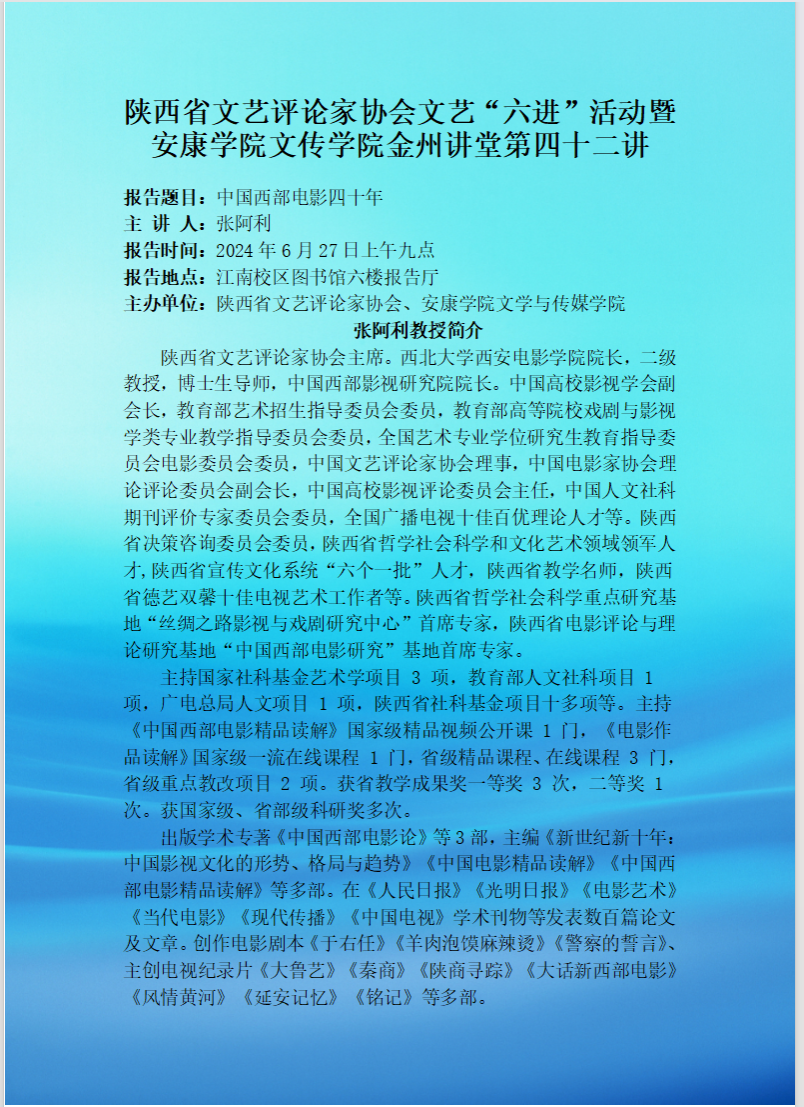 导航痕迹 首页 > 新闻通知 > 通知公告 > 正文 学院新闻 通知公告 陕西省文艺评论家协会文艺“六进”活动暨今年会官网文传学院金州讲堂第四十二讲 发布人:文传学院 发布日期:2024年06月26日 阅读次数: