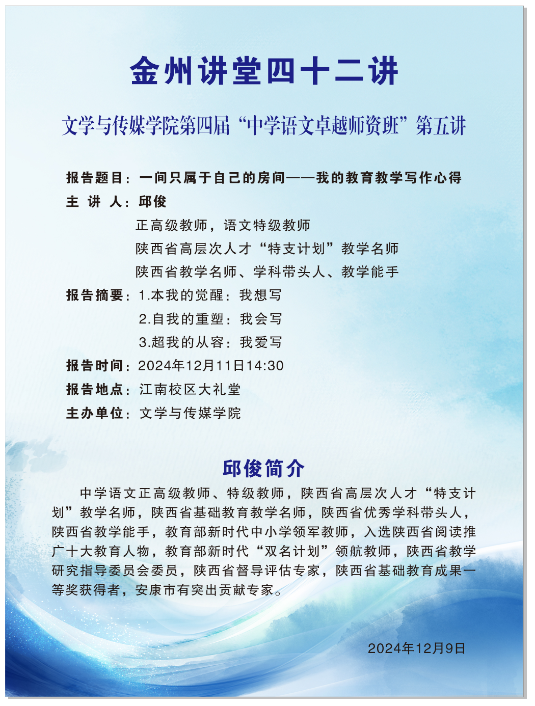 导航痕迹 首页 > 新闻通知 > 通知公告 > 正文 学院新闻 通知公告 金州讲堂四十二讲 主讲人:邱俊(陕西省高层次人才“特支计划”教学名师) 发布人:文传学院 发布日期:2024年12月09日 阅读次数: