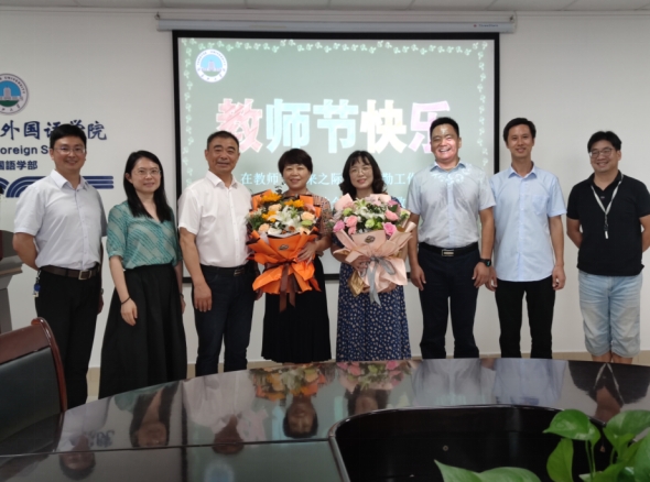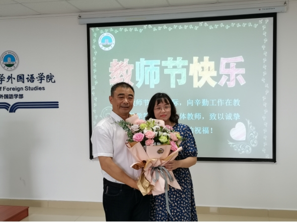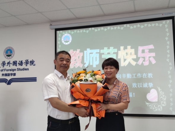 在文科楼712会议室,周从标副校长为德赢官网从教30年教师代表谈宏慧教授、2021年“任大龙奖教金”获得者樊辉老师献上了鲜花,并送上节日的祝福。