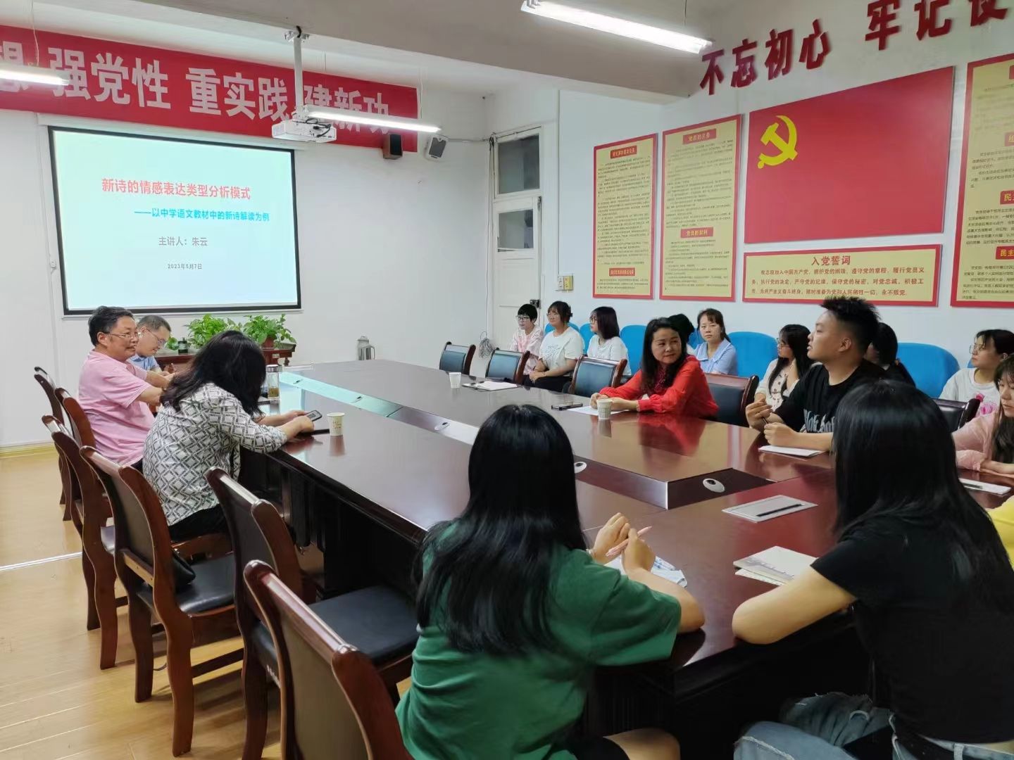 沙龙活动首先由主讲人汇报主题报告内容。朱云老师先阐述了选题背景,一是因为学院学科教学(语文)申硕需要,希望引起大家对中学语文教学研究的关注;二是针对当前中学语文新诗教学存在割裂语言形式分析和思想意蕴分析的误区。然后,他运用袁可嘉先生的诗歌类型理论,以中学语文教材中的多首新诗为例,深入阐述了新诗情感类型分析的基本模式及其教学实践价值。