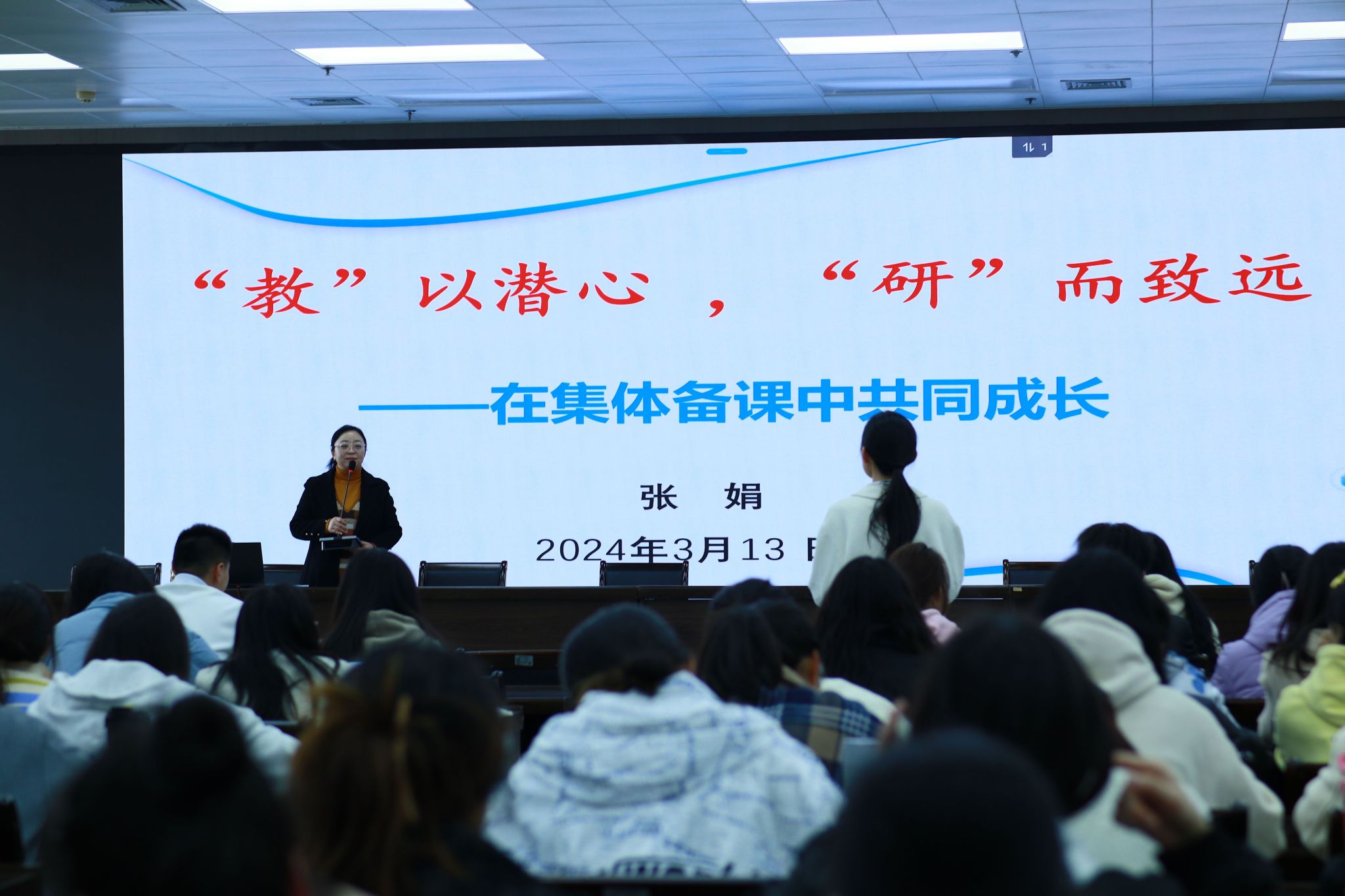 2024年3月13日下午三点半,在图书馆报告厅,今年会jinnianhuicom邀请到汉滨高级中学永红校区陕西省教学能手张娟老师为第三届“中学语文卓越师资班”带来题为《“教”以潜心 ,“研”而致远——在集体备课中共同成长》的精彩讲座。班主任唐明珍和“中学语文卓越师资班”全体学生聆听了本场讲座。