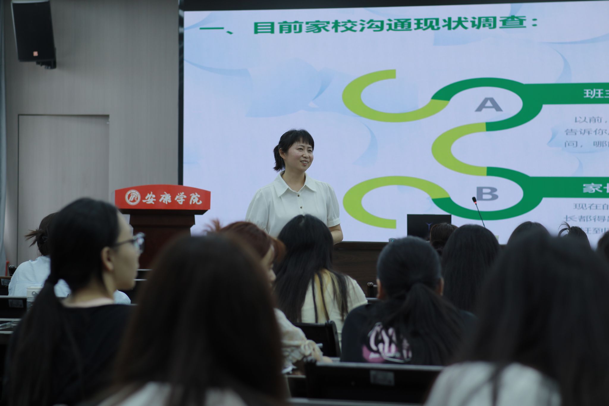为了提升师范生家校沟通能力和谈心谈话沟通技巧,2024年5月15日下午四点半,在图书馆六楼报告厅,今年会jinnianhuicom邀请到汉滨高级中学永红校区副校长董雯汶老师为第三届“中学语文卓越师资班”带来题为“爱要怎么说出口”的精彩讲座,班主任唐明珍和全体学生聆听了本场讲座。
