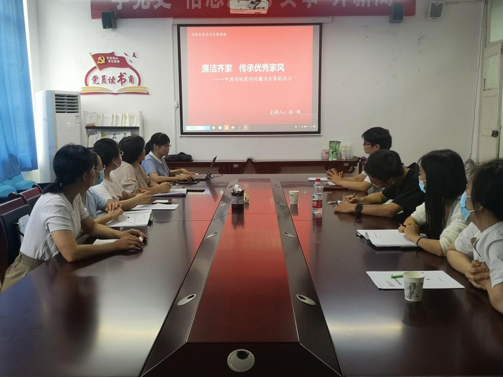 9月7日下午,文传学院教工第一党支部开展了“廉洁齐家,传承优秀家风”主题党日活动,活动在2307会议室举行,由支部书记韩文霞主持,支部全体成员参加学习。