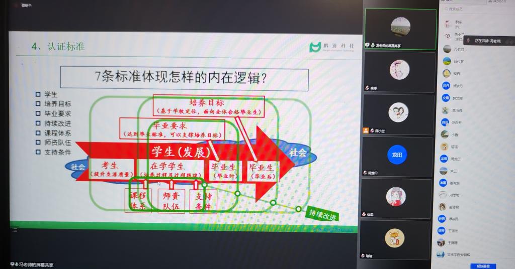 导航痕迹 首页 > 师范专业认证 > 活动新闻 > 正文 政策文件 活动新闻 师范生技能大赛 文传学院召开师范专业培养方案及课程大纲修订线上培训会 发布人:文传学院 发布日期:2022年04月06日 阅读次数: 4月1日晚,文传学院组织全体教师在腾讯会议平台参加了师范专业培养方案及课程大纲修订线上培训会,会议由教学副院长李婷主持,认证专家冯彬老师为主讲人。 冯老师首先讲了专业认证理念体系与内涵,主要包括认证工作来源与进展、认证的三大理念、以学生为中心的教学模式、认证标准、认证底线、面向产出的机制、认证申请工作流程和评审要点等内容。接着重点以现代汉语课程教学大纲为例,详细解读了课程目标与毕业要求的关系,课程考核评价方式及评价标准的编写细则。 此次会议通过生动案例的讲解,让学院教师对师范专业认证中培养方案和课程大纲的修订有了更深的认识,为接下来的具体修订工作提供了切实可行的指导。 撰稿/摄影/韩文霞 审核/李婷 发布/崔瑜