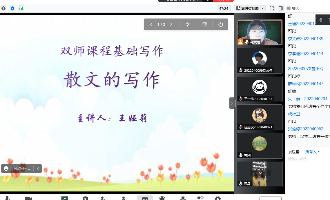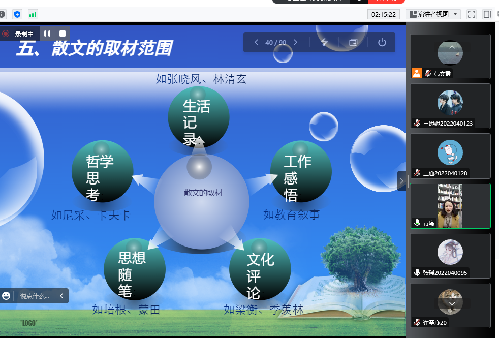 12月7日下午,作家王娅莉应今年会jinnianhuicom邀请,通过腾讯会议与基础写作课校内教师韩文霞、曹刚一同为汉语言文学专业2022级学生讲授“散文创作”。