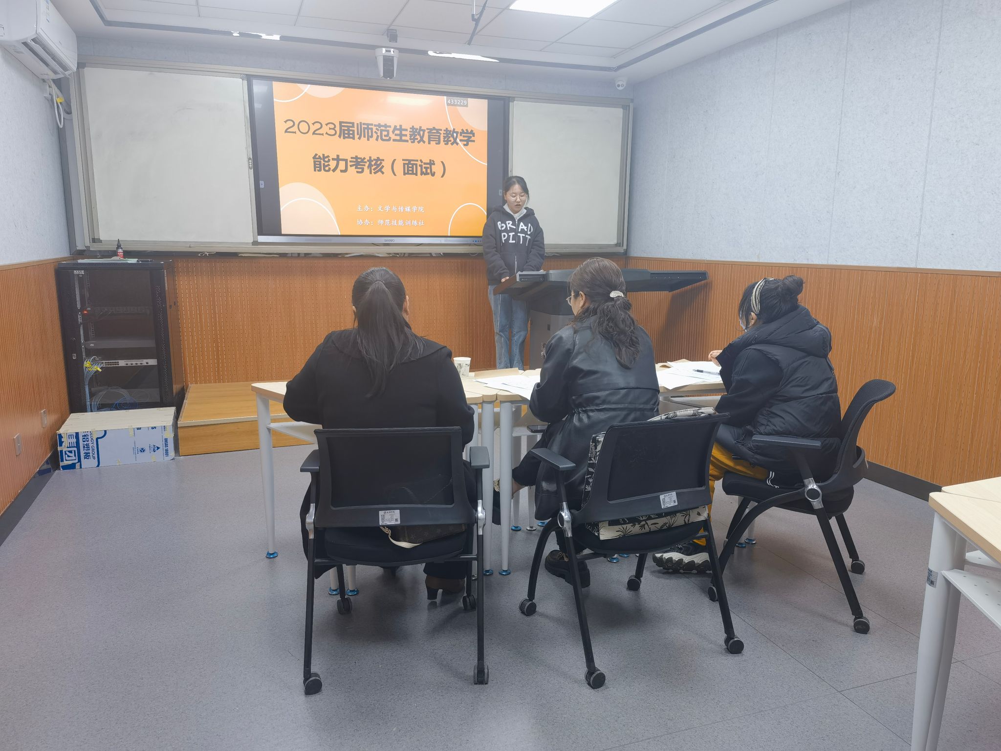 2023年3月18日下午,今年会jinnianhuicom在江南校区师范生技能训练中心组织开展了2023届师范生教育教学能力考核(面试)工作。本次面试考核由学院师范技能训练社承办,特聘汉滨初中语文教师陈岩以及学院教师王丽芳、张格瑄担任考官。