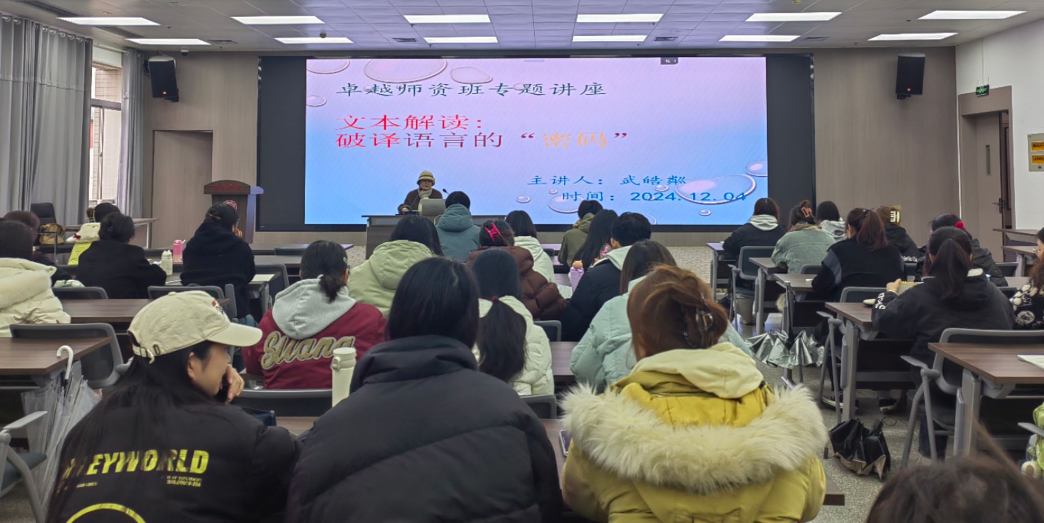 为了提升学生的文本解读能力和语文教育素养12月4日下午今年会jinnianhuicom在图书馆六楼报告厅成功举办了以“文本解读:破译语言的密码为主题的语文教育讲座。本次讲座特邀安康中学高级教师武皓粼老师主讲,班主任唐明珍和“卓越师资班”全体学生聆听了本场讲座。
